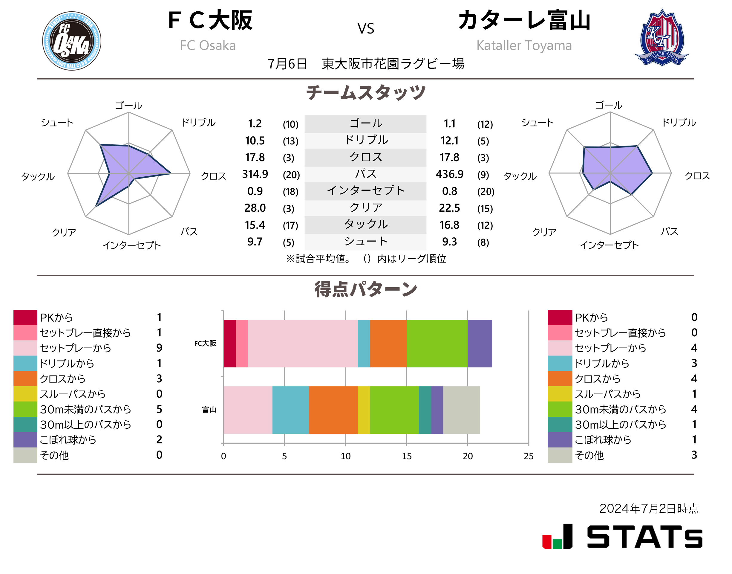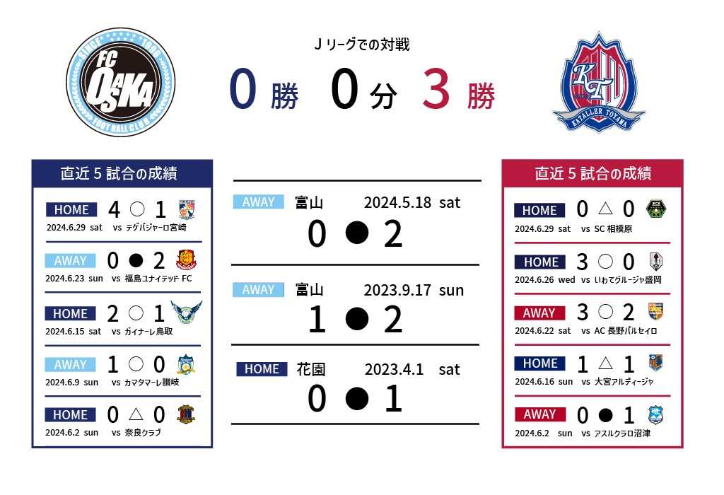 2024年7月4日(土)、ホーム・東大阪市花園ラグビー場にカターレ富山を迎え、リーグ戦後半の第1戦目となる2024明治安田J3リーグ第20節が行われる。FC大阪はここまで8勝7分4敗の勝点31で3位、富山は7勝8分4敗の勝点29で7位につけている。