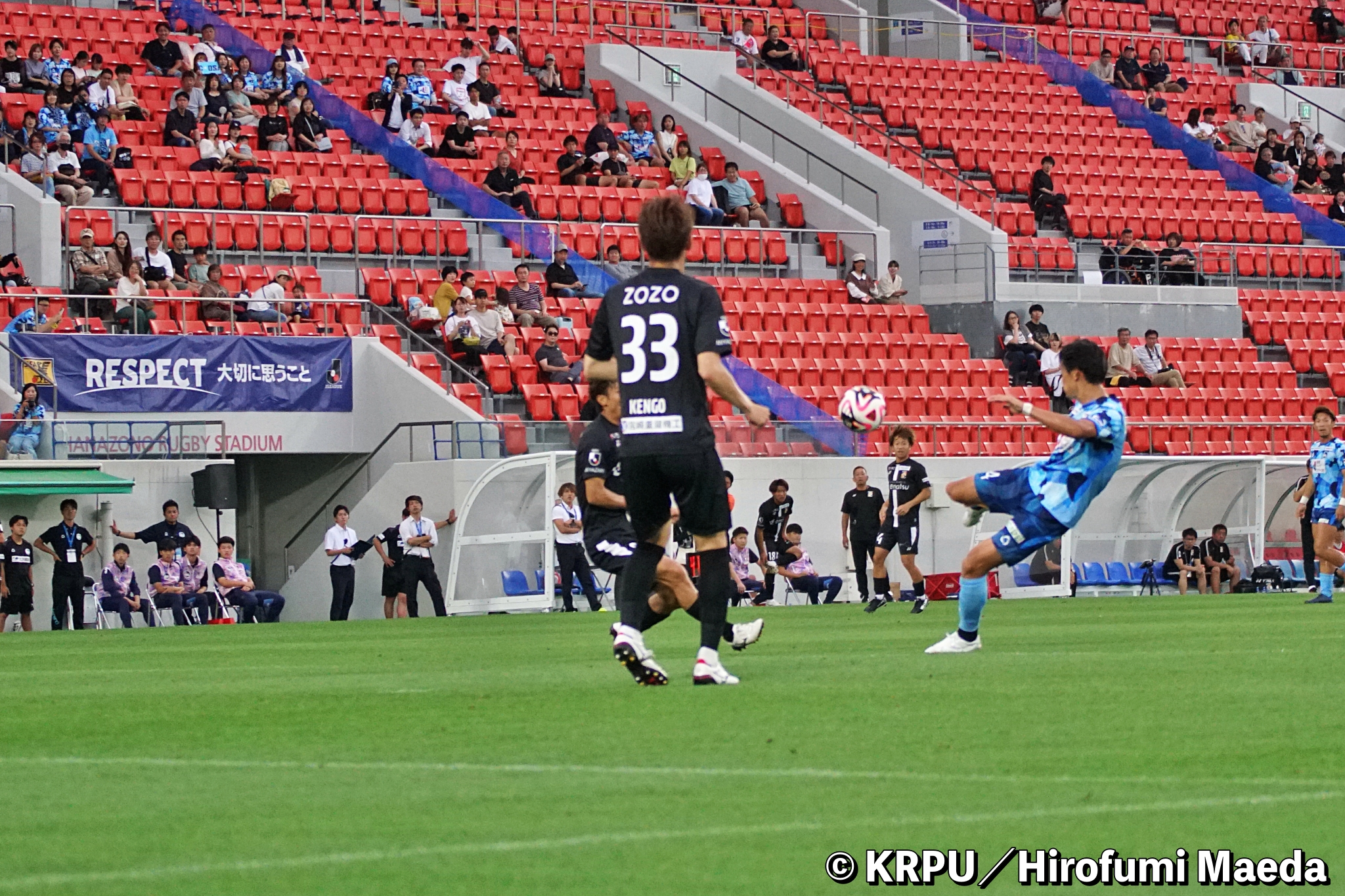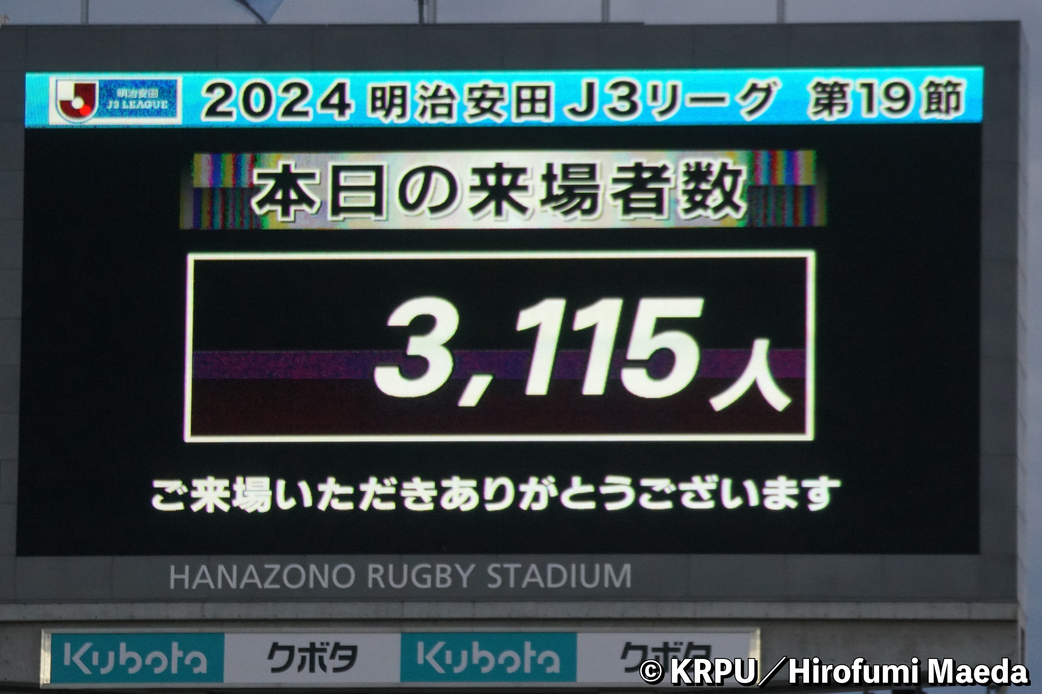 2024年6月29日(土)、2024明治安田J3リーグ第19節vsテゲバジャーロ宮崎戦がホーム・東大阪市花園ラグビー場で行われた。約1ヶ月ぶりの花園でのゲームには、3,115人が集まった。前節で連勝がストップし、連敗は避けたい一戦。梅雨の中休み、まだ暑さの残る17時03分にキックオフ。
