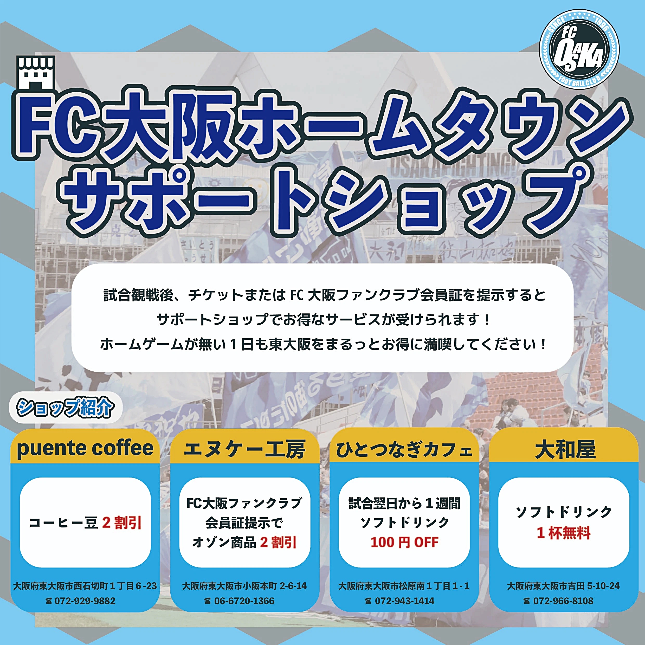 FC大阪ホームゲーム開催時、試合観戦に来ていただいた方を対象に、東大阪市内の該当店舗にて特典としてオリジナルのサービスが受けられます!