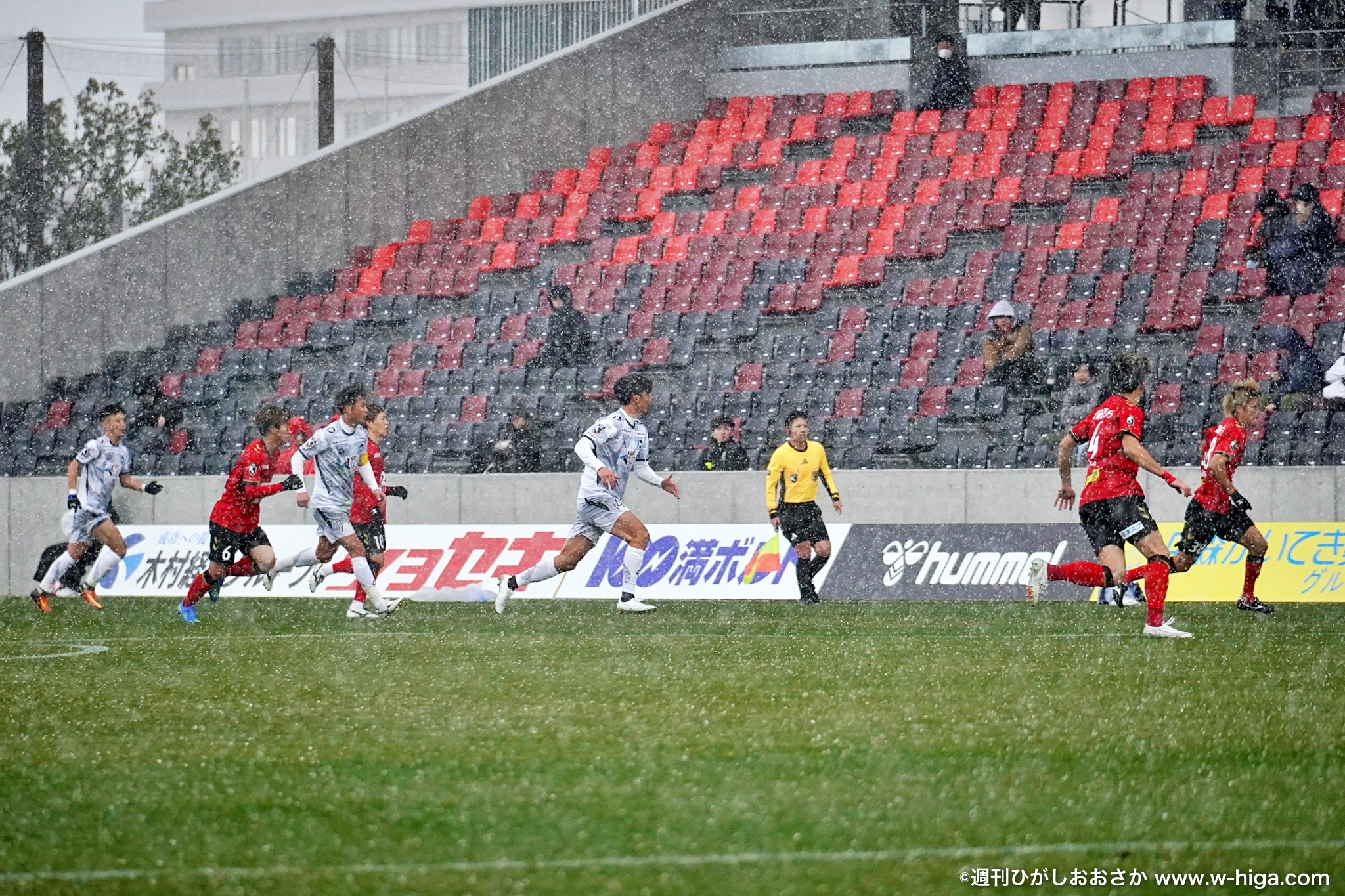 試合前に降り始めた大雨が直前に止んだ19:03、FC大阪ボールでキックオフ。