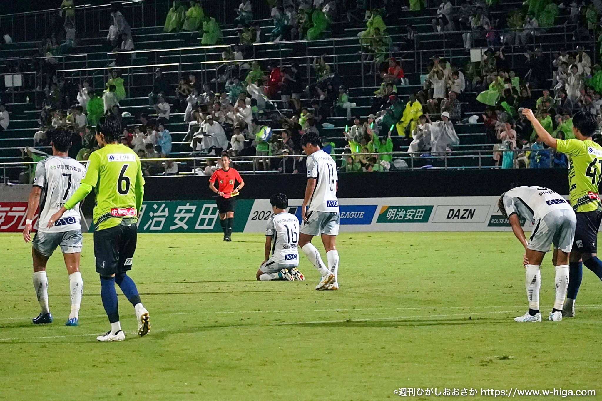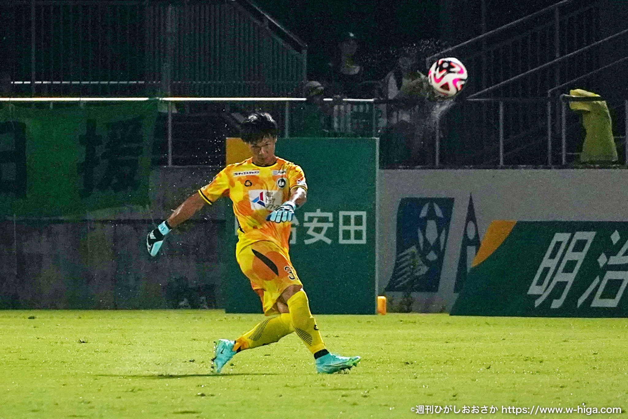 このプレーの直後、雷が強くなり試合が47分間の中断。さらに、失点の際に頭を打ったGK永井建成が脳震盪と診断され、絶対的守護神が交替。代わって入った山田晃士はFC大阪のデビュー戦に。
