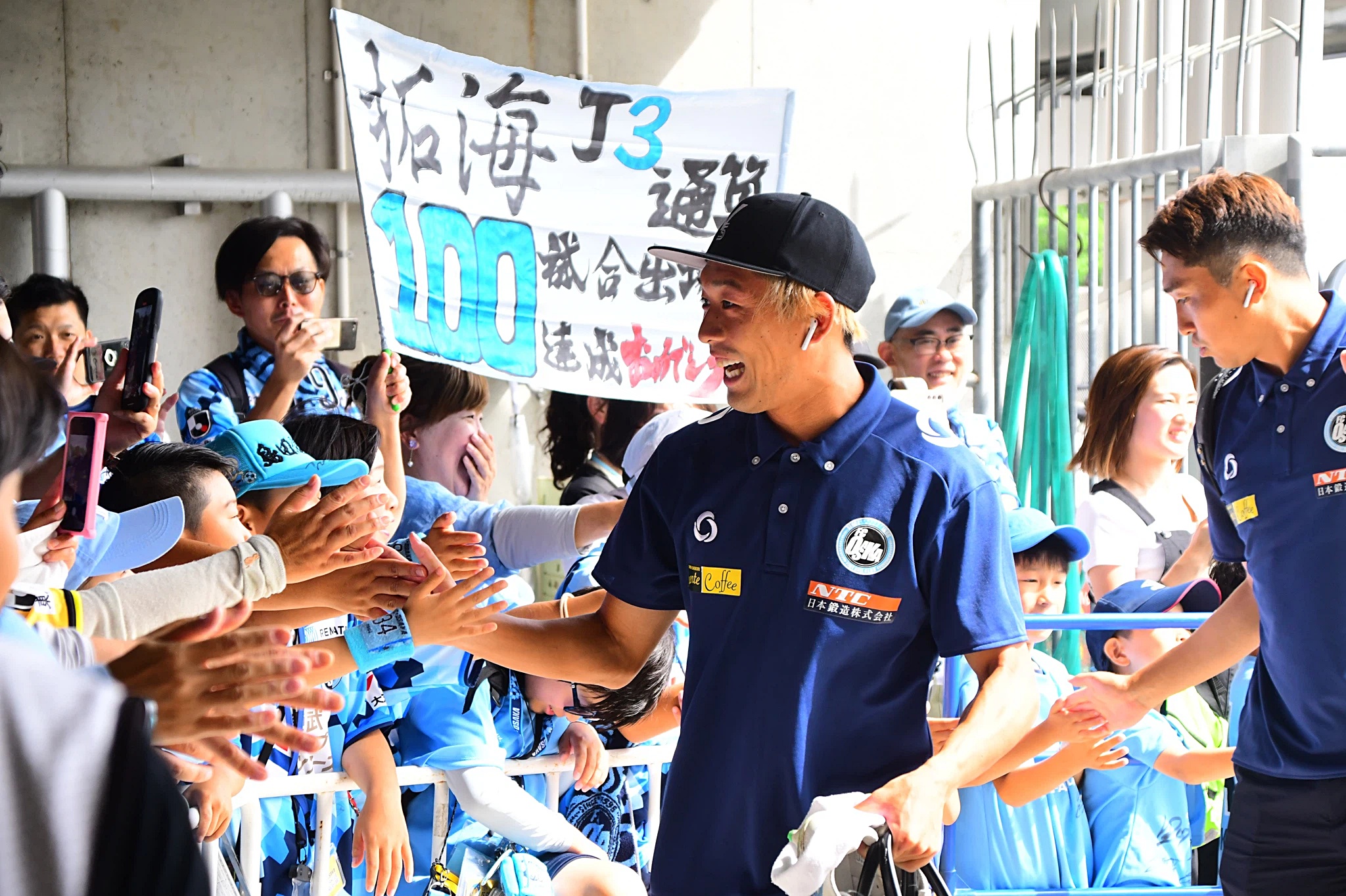 スタジアム入りする選手を関係者しか入れない特別ポイントにてお出迎え!