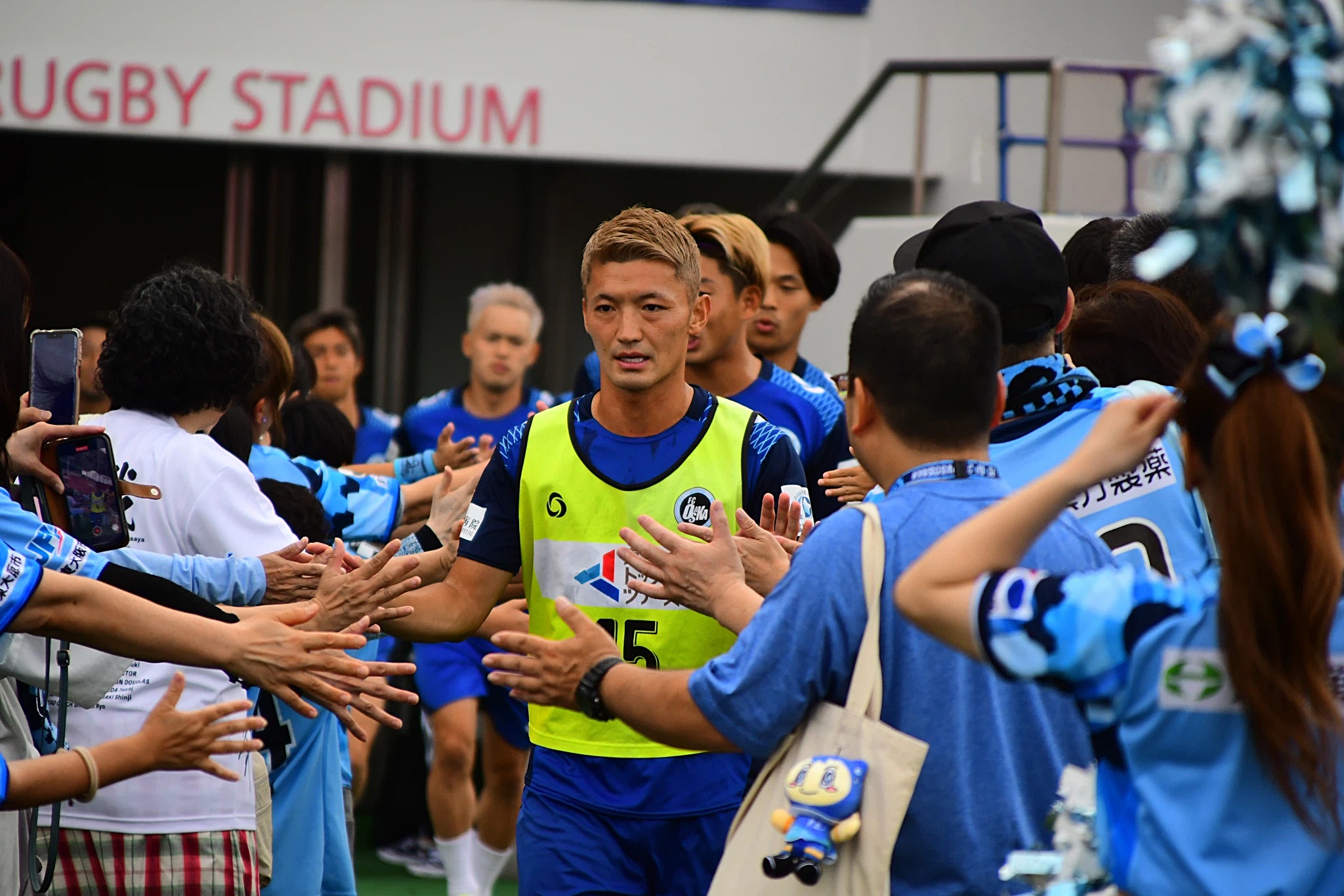 試合開始前の選手ピッチ内ウォーミングアップ時に、登場する選手をハイタッチでお出迎え!