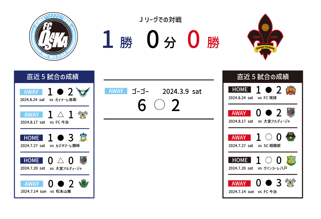 2024年8月30日(金)、ホーム・たけびしスタジアム京都にツエーゲン金沢を迎え、2024明治安田J3リーグ第26節が行われる。FC大阪はここまで8勝10分7敗の勝点34で11位、金沢は11勝6分8敗の勝点39で6位につけている。初対戦となったリーグ戦前半にアウェイで対戦した際は、6-2で快勝。