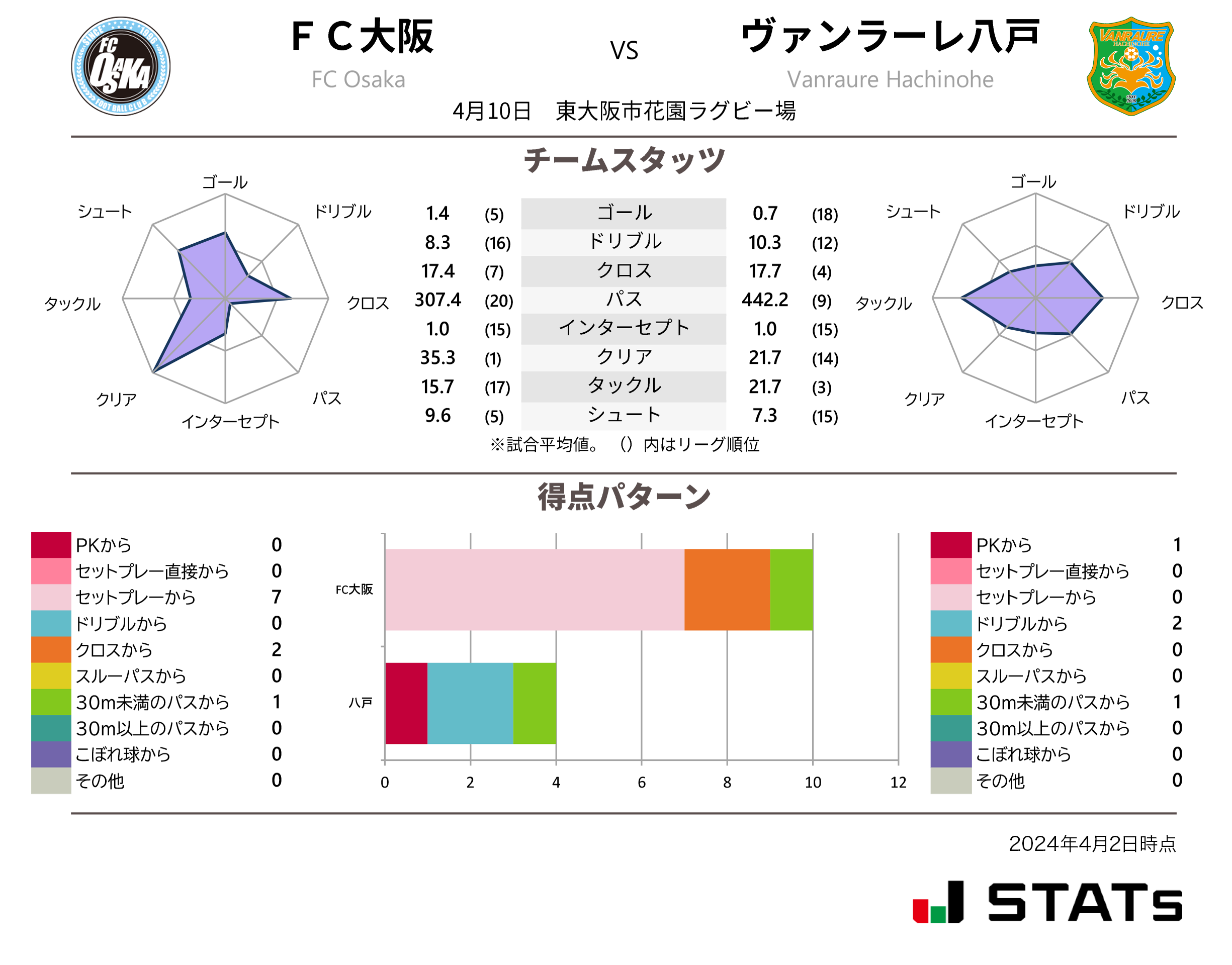 2024年4月10日(水)はホーム・東大阪市花園ラグビー場にヴァンラーレ八戸を迎え、2024明治安田J3リーグ第9節が行われる。FC大阪はここまで3勝4分1敗の勝点13で5位、八戸は1勝3分3敗の勝点6で17位。