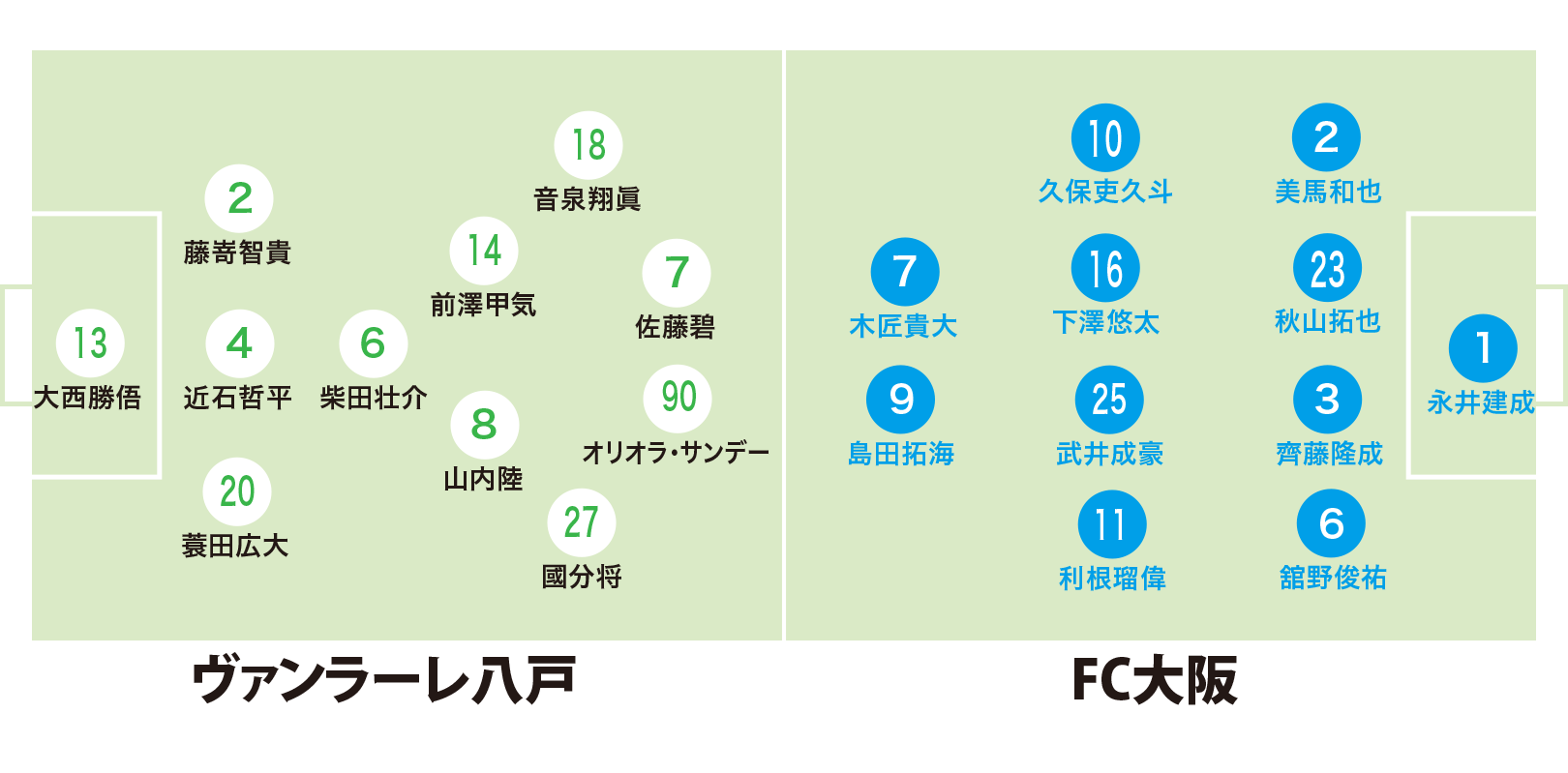 第7節までを終えてFC大阪は3勝4分、1試合少ない大宮は4勝2分と負けなし同士の対戦。試合開始から勢いよく飛び出したのはFC大阪。前線からの激しいプレスで相手のミスを引き出し、上手く攻撃につなげていく。決定機はFC大阪のほうが多く、40分にはMF久保吏久斗のアーリークロスにMF田中直基が合わせるも、惜しくも外れる。さらに44分、敵陣で相手DFのミスからFW木匠貴大がボールを奪うと、そのままペナルティーエリア内へ。相手GKが出て来たところでループシュートを放つが、あとわずか数メート届かず相手DFに掻き出されてしまう。