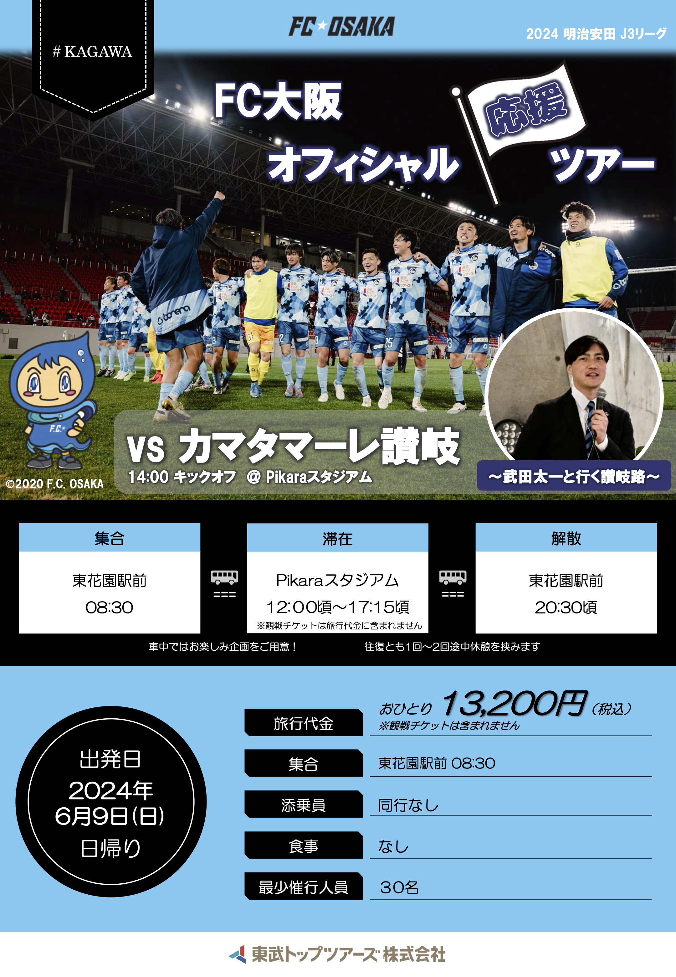 みんなでFC大阪のアウェーゲームで応援しませんか。6月9日に香川県・Pikaraスタジアムにて行われるvsカマタマーレ讃岐戦に合わせて近鉄東花園駅出発のオフィシャル応援ツアー(日帰り)を開催します。